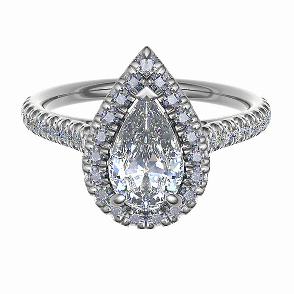 The perfect proposal piece! Say 'YES' to sparkle with the ever- popular pear shaped diamond halo engagement ring