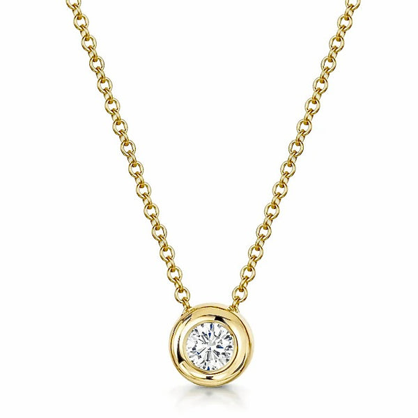 Contemporary diamond solitaire slider necklace crafted in 18ct gold. This elegant design features a round brilliant-cut diamond in a bezel setting, threaded onto a fine trace chain.